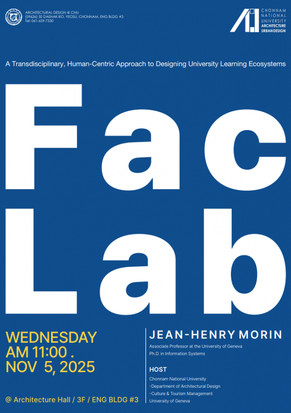 Fac Lab 페이지 정보 작성자 최고관리자 댓글 0건 조회 23회 작성일 25-11-11 10:01 목록 답변 본문 J E A N - H E N R Y M O R I N- Associate Professor at the University of Geneva- Ph.D. in Information SystemsHOSTChonnam National University-Department of Architectural Design-Culture & Tourism ManagementUniversity of Geneva 다음글SPECIAL LECTURE 25.11.11 댓글 0 댓글목록 등록된 댓글이 없습니다.